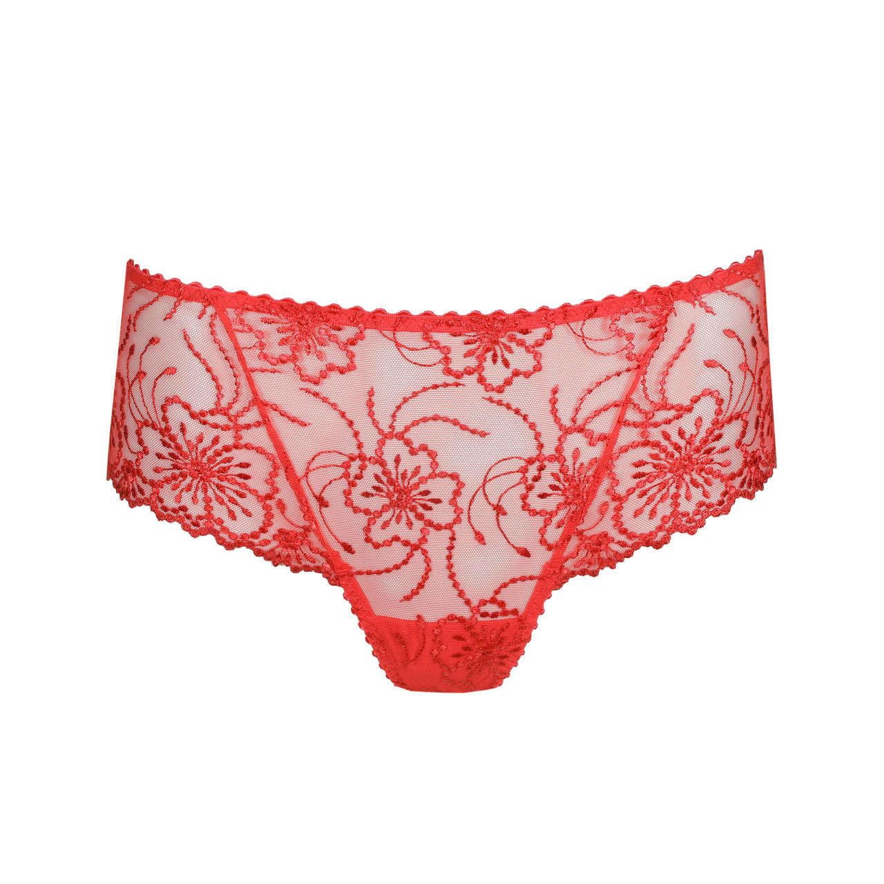 De speciale slip met hoge taille speel met luxueuze mesh en suggestieve straling. Puur en diep rood, dat is Fiesta Red